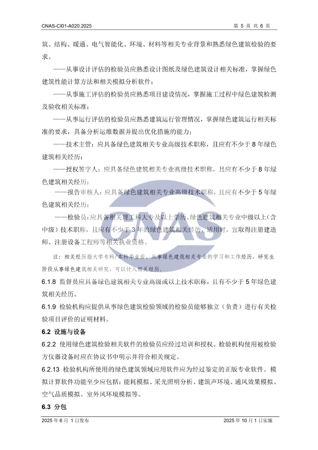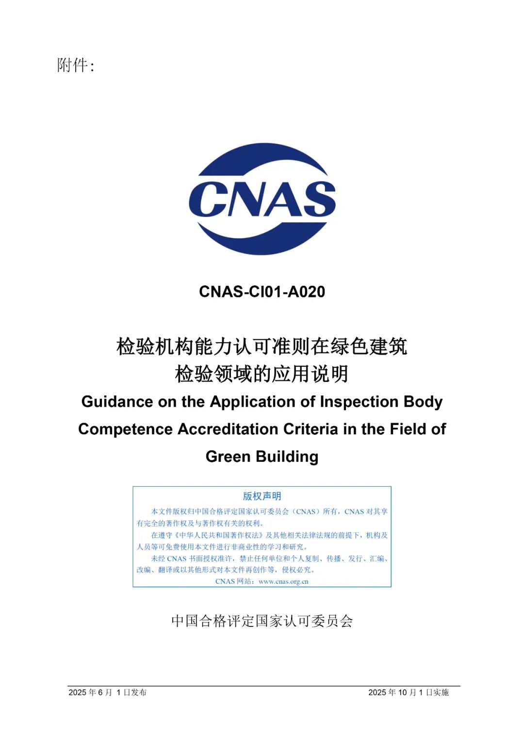 为进一步规范绿色建筑领域检验机构认可,中国合格评定国家认可委员会(CNAS)秘书处近期组织制订了CNAS-CI01-A020:2025《检验机构能力认可准则在绿色建筑检验领域的应用说明》,现已发布,将于2025年10月1日实施。