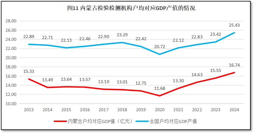 由图11可见,内蒙古自治区检验检测机构户均对应的GDP值呈现一个先降后升的变化,从2013年的15.33亿元降低到2020年的11.68亿元,之后慢慢又回升到2024年的16.74亿元。从内蒙古自治区户均对应GDP的值与全国情况进行比较可见,内蒙古自治区检验检测机构户均对应当地GDP的数值一直远低于全国平均数,最近几年两者的差距保持在8亿元左右,差距比较稳定,变化规律也比较相似。内蒙古自治区的数据表明,由于区域经济总体落后,内蒙古自治区检验检测行业显得规模过大,机构数量过多,当地经济体量难以有效支撑检验检测行业的发展。